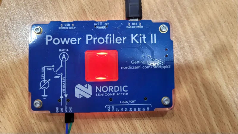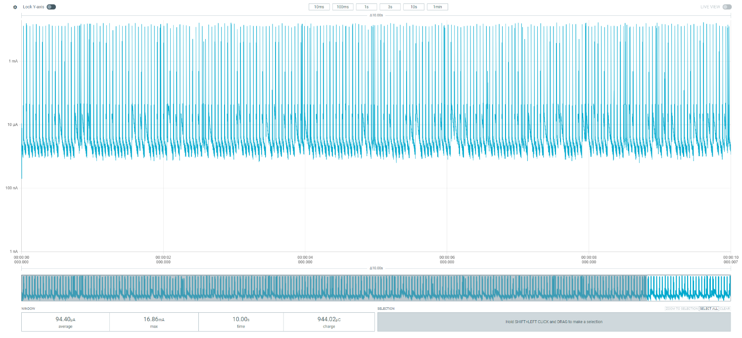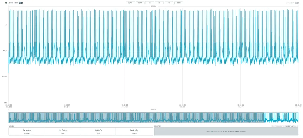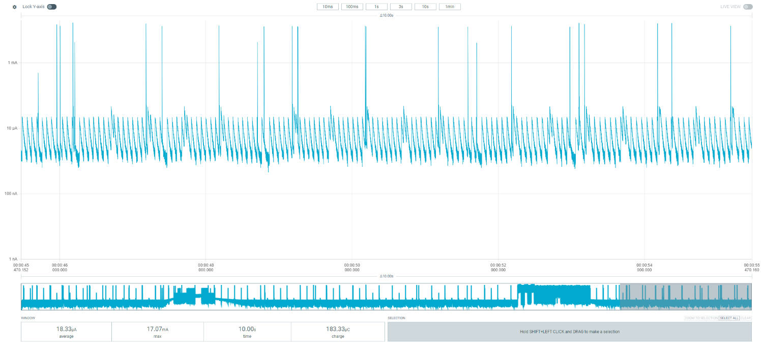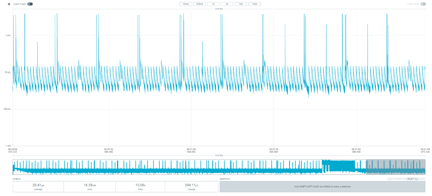 The current consumption graphs in the rest of this page are screenshots from the Nordic Power Profiler software which accompanies this hardware.