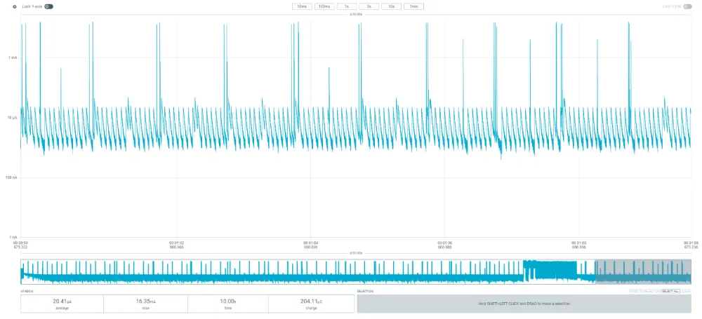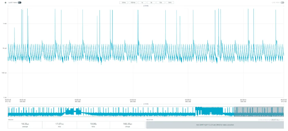 Now if we change the connection interval from 30ms to 1000ms we get a significant current consumption to 20.4uA: