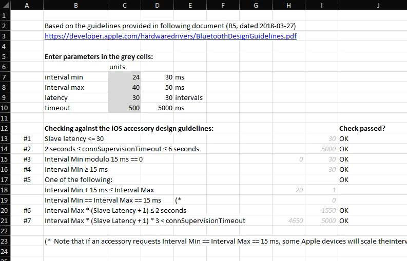 Silicon Labs provides an Excel spreadsheet which can validate your connection parameters to make sure they are within Apple’s guidelines2. It can be downloaded from here.