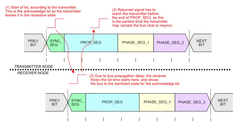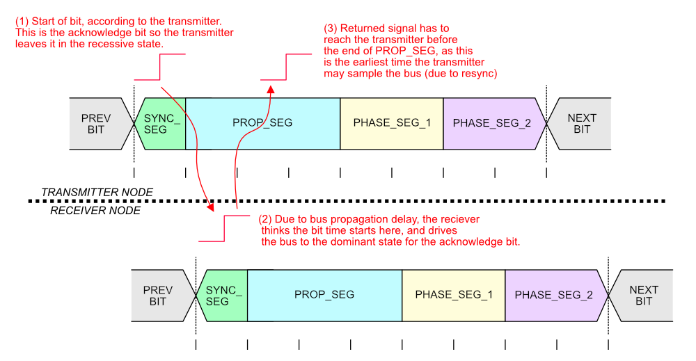 Because any CAN node may sample the bus as soon as PROP_SEG is over, the two way propagation of the signal between any two nodes on the bus must occur before the end of PROP_SEG. The below figure illustrates this between two nodes, one which is the transmitter and another which is the receiver. The signal has to propagate back from the receiver to the transmitter within this time because the transmitter needs to read back values from the bus during arbitration and the acknowledge bit.