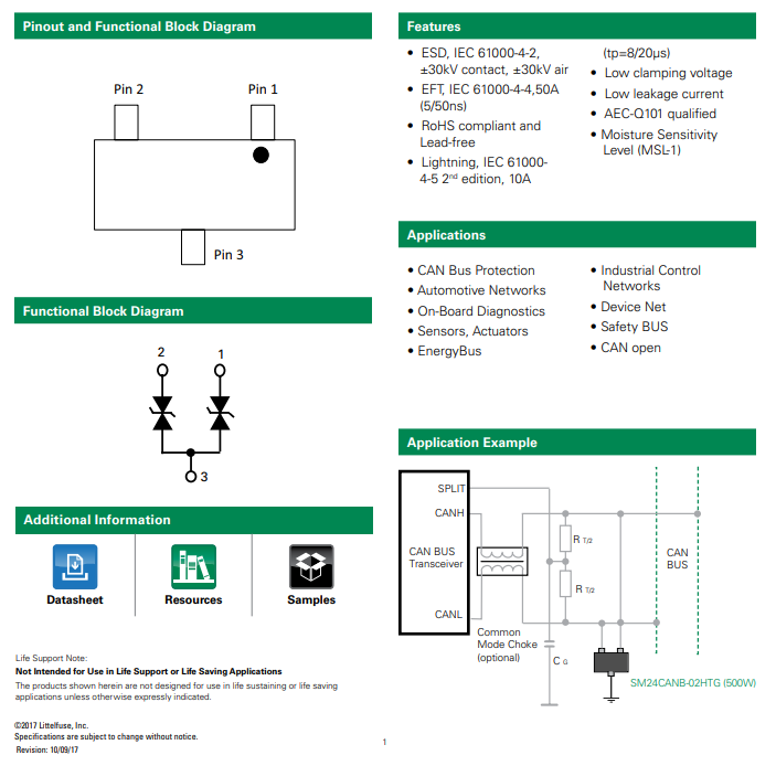 There are TVS diode components specifically designed for CAN bus ESD suppression. Single diode 2-pin packages or double (termed a diode array) TVS diode 3-pin packages are common. Common standoff voltages are and and common power dissipations are .