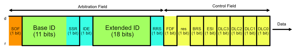 Below is the arbitration and control field frame structure for a FEFF frame (29-bit ID). The black outline shows whether certain bits are dominant (d), recessive (r) or can be either.