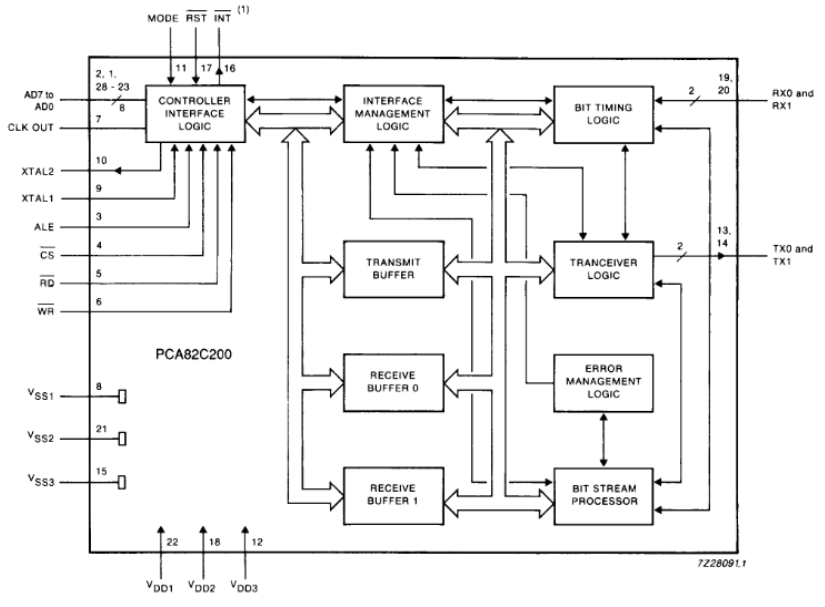 The PCA82C200 is “the” classic original CAN controller. It used a parallel interface (8 address lines + control lines). The Phillips datasheet I found for this part dated back to October 199016.