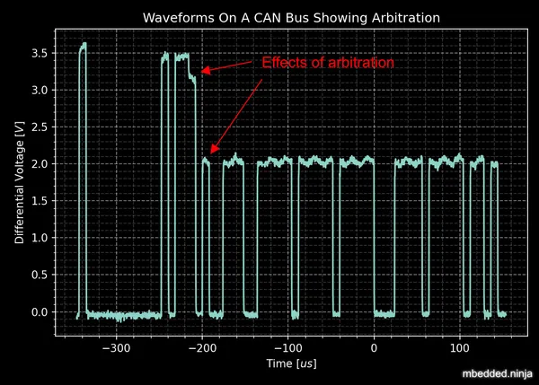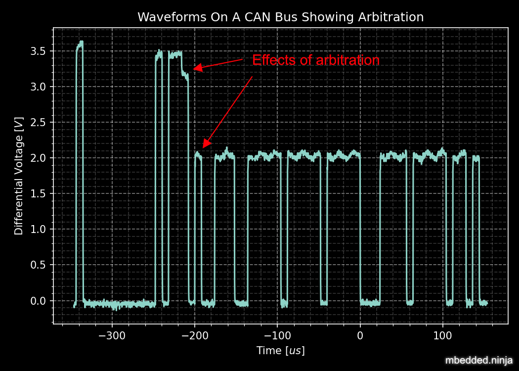 The below image shows arbitration happening with a real-world scope capture, by showing the changing dominant bus voltage as driving transceivers lose arbitration and “drop” off the bus.