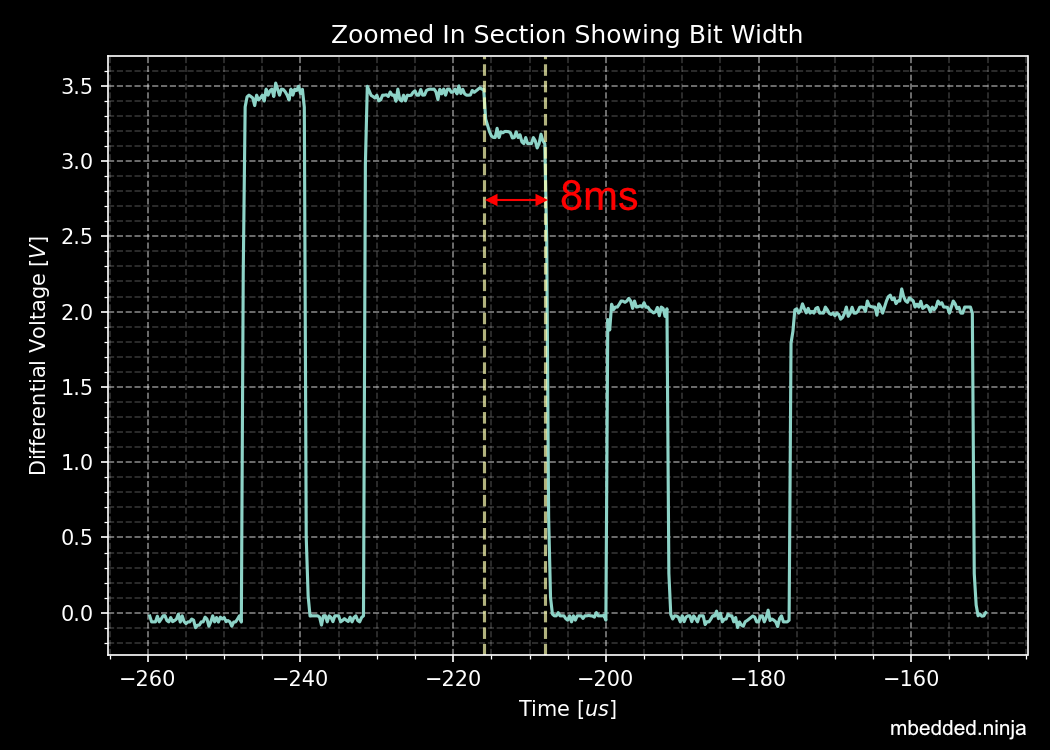 If we zoom in on one of the arbitration events as below we can see it aligns with the bit period of 8us (the CAN bus was running at 125kHz).