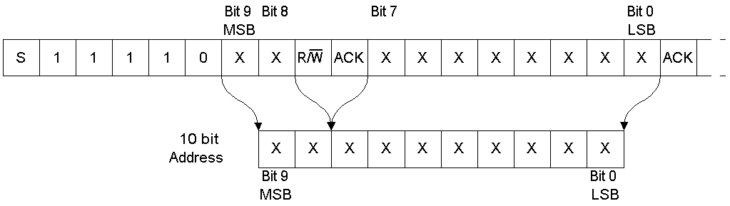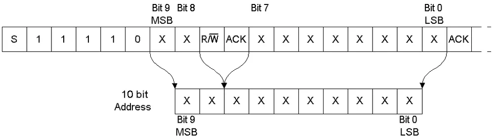 The 10-bit addressing scheme involves two address bytes (instead of just one). The first byte includes the bits 11110 (in bit positions 7:3) which is a reserved code to indicate that a 10-bit address follows. The actual 10-bit address is sent in bits 2:1 of the first address byte (the MSB) and bits 7:0 of the second address byte (LSB).