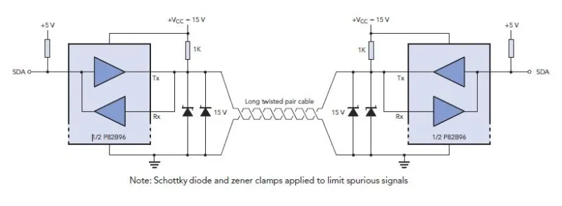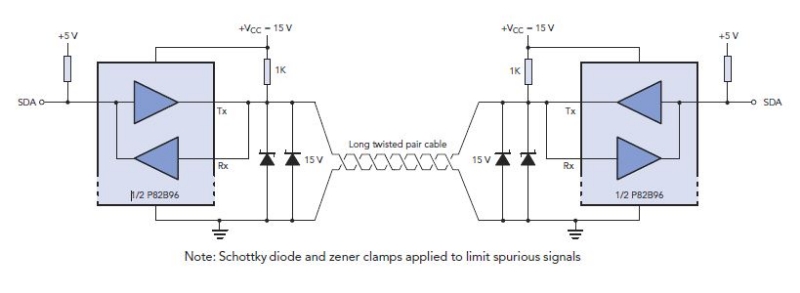 The I2C transmission distance can also be extended by using I2C buffer IC’s. These chips buffer the inputs and provide high output drive signals useful for sending down long cables. Some also support RX/TX splitting (sending the RX and TX signals from the SDA down separate lines to increase transmission times), as well as differential line driving). Buffering the I2C lines introduces a ‘lock-up’ problem, in which if the bus is driven low, the receiver will keep it low even after the sender has released it. To stop this from happening, manufacturers cleverly introduced two ‘logic-low’ levels, which both conform to the logic-low of the I2C standard. Typically anything 0.5V is counted as a true ‘low’ (which is propagated through the buffer), while anything between 0.5V and 0.9V is a buffer-generated low which is not propagated.
