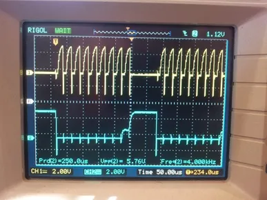 The picture below shows how cross-coupling can introduce noise onto the SDA and SCL lines when using long cables. This shows SCL (yellow) and SDA (blue) over an 8m ethernet cable.