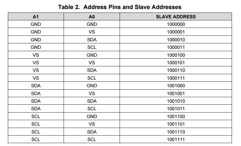 Newer pin-constrained I2C slave devices allow you to connect the address pins up to SCL and SDA to further increase the number of assignable addresses. With two address pins, and the possibility of connecting each up to either , GND, SCL or SDA, gives a total of 16 different I2C addresses ().