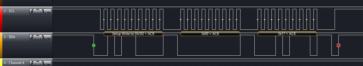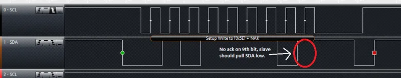 The following image shows an I2C slave that is not responding. Notice the absence of an “ACK” on the SDA line on the 9th clock pulse. The slave should of pulled this low.