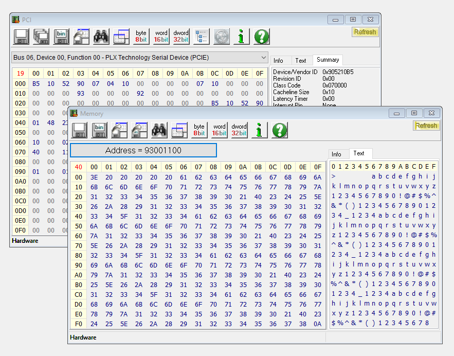 RWEverything is a great Windows tool that allows you to read and write from any available memory location on the PCIe card (not just the configuration memory, as many other tools provide).