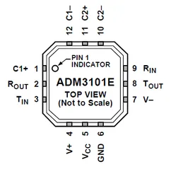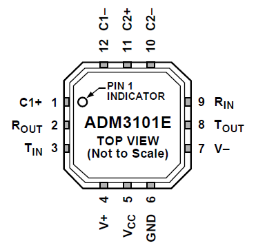 The pinout of a typical Analog Devices RS-232 to UART transceiver is shown below.