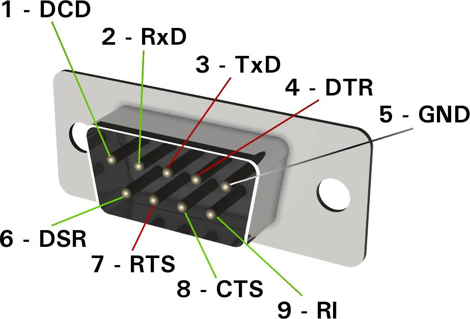 | RxD (Data Receive) | DCE -> DTE | The DCE sends data to the DTE over this line. | 3 | 2 |
