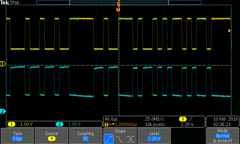 The waveform in This is a placeholder for the reference: fig-typical-rs-485-a-b-waveforms-during-communication shows the voltage on the A and B nets of a RS-485 bus when operating normally at 115200 baud.