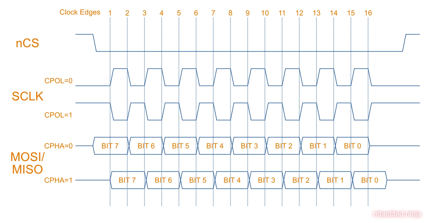 A common point of confusion is what clock phase (CPHA) means for data sampling/shifting for the different clock polarities. I have seen many sites and diagrams online which state that a clock phase CPHA of 0 means that data is sampled on the rising edge (this is only true is CPOL is also 0).