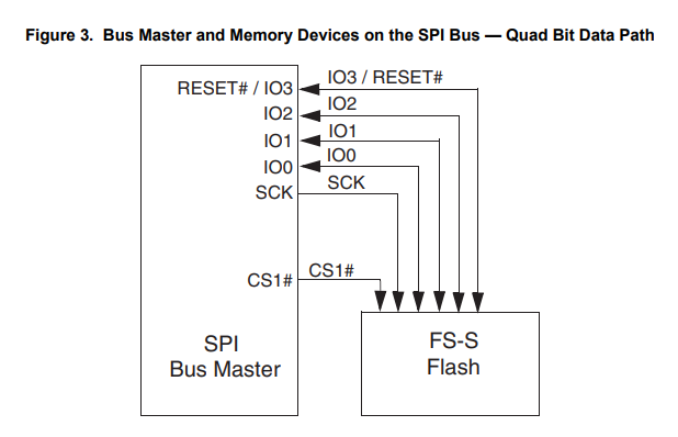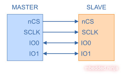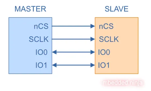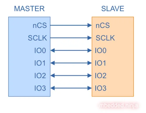 QSPI takes this idea even further and adds two additional bi-directional data lines, IO2 and IO3, as shown in the following diagram: