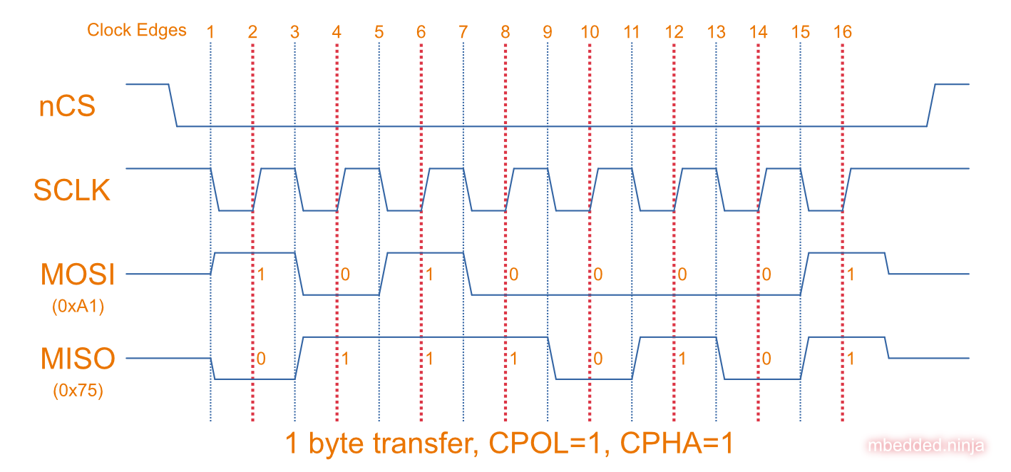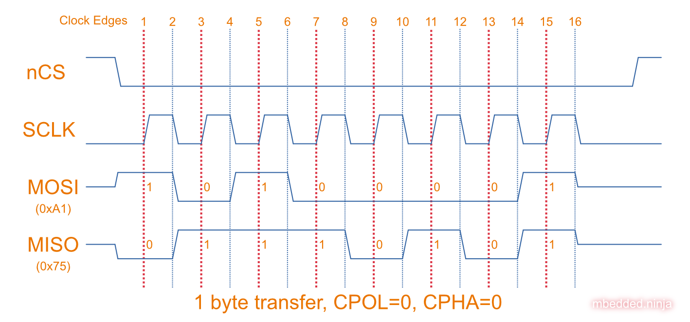 Below shows an example of a single-byte transfer with CPOL=0 and CPHA=0. The master sends the data 0xA1 and the slave sends 0x75. Data is sampled at the dotted red vertical lines.