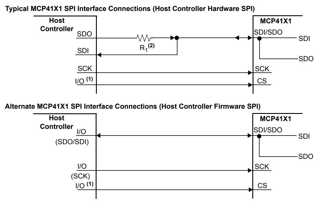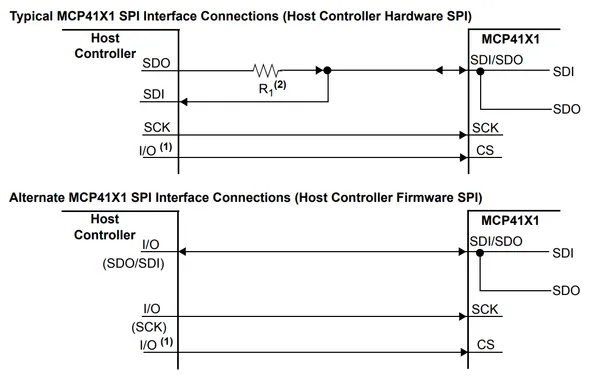 Some low-pin count packaged ICs use shared MOSI/MISO lines. One such example is some of the DPOTs in the Microchip MCP4XXX family. The 8-pin potentiometer variants such as the MCP4131 contain a single MOSI/MISO pin (called SDI/SDO). This obviously prevents data from being transmitted in both directions at the same time. If connecting such a device up to a normal hardware SPI peripheral, a resistor is needed to prevent driver contention (as shown in the below image) when the MCP4131 sends data back to the microcontroller. If you are bit-banging the SPI communications, you can smartly turn the host controller output into an input at the right clock edge to receive data and eliminate the need for the resistor.