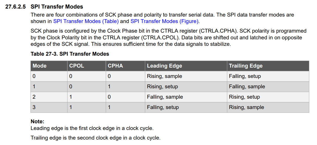 To give you an example of what it means for firmware, below is a screenshot of the SPI modes table from the Microchip SAM D21 MCU datasheet. We are lucky in this case, the SAMD21 microcontroller supports all four modes of operation.