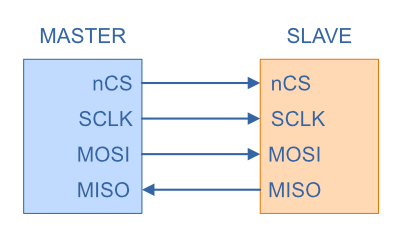 | MOSI | Master out, slave in. A.k.a. main out, subnode in. The master drives the line and provides data to the slaves. Only the slave with nCS asserted (low) listens to the data. |