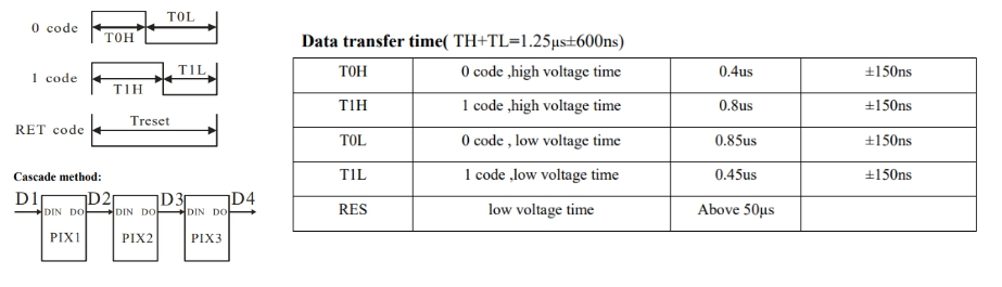 Depending on the MCU, generating these timings by “bit-banging” could be difficult because of the fast baud rate and HIGH/LOW timing requirements. However, an SPI peripheral running at a faster bit rate can be used to generate the data relatively easily. One option is to set the SPI speed so there are three SPI bits for every WS2812 bit. The SPI bit period can be set to 0.4us, so that three bits takes 1.2us. Then you can send the SPI bit pattern 100 for a WS2812 0 and a 110 for a WS2812 18. Using 8 SPI bits per WS2812 bit is another approach.9
