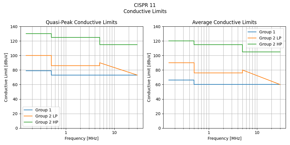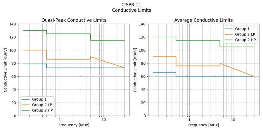 CISPR 11 conductive EMC limits (both quasi-peak and average) for Group 1, Group 2 LP and Group 2 HP devices.