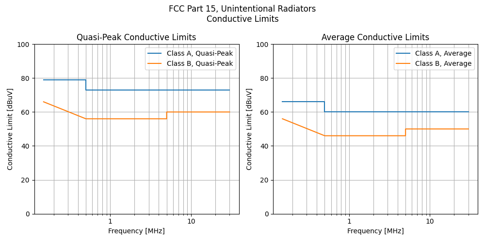 Graphs of Class A and B conductive limits for unintentional radiators as per FCC Part 15.