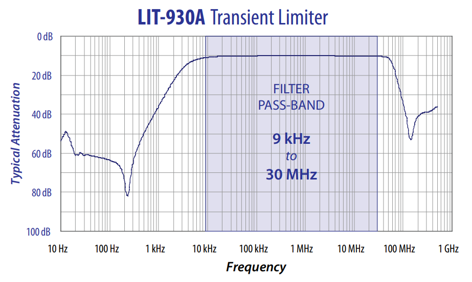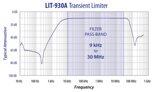 Frequency response of the LIT-930A transient limiter by Com-Power8. Graph shows a flat 10dB attenuation across the pass-band between 9kHz and 30MHz. Image © Com-Power.