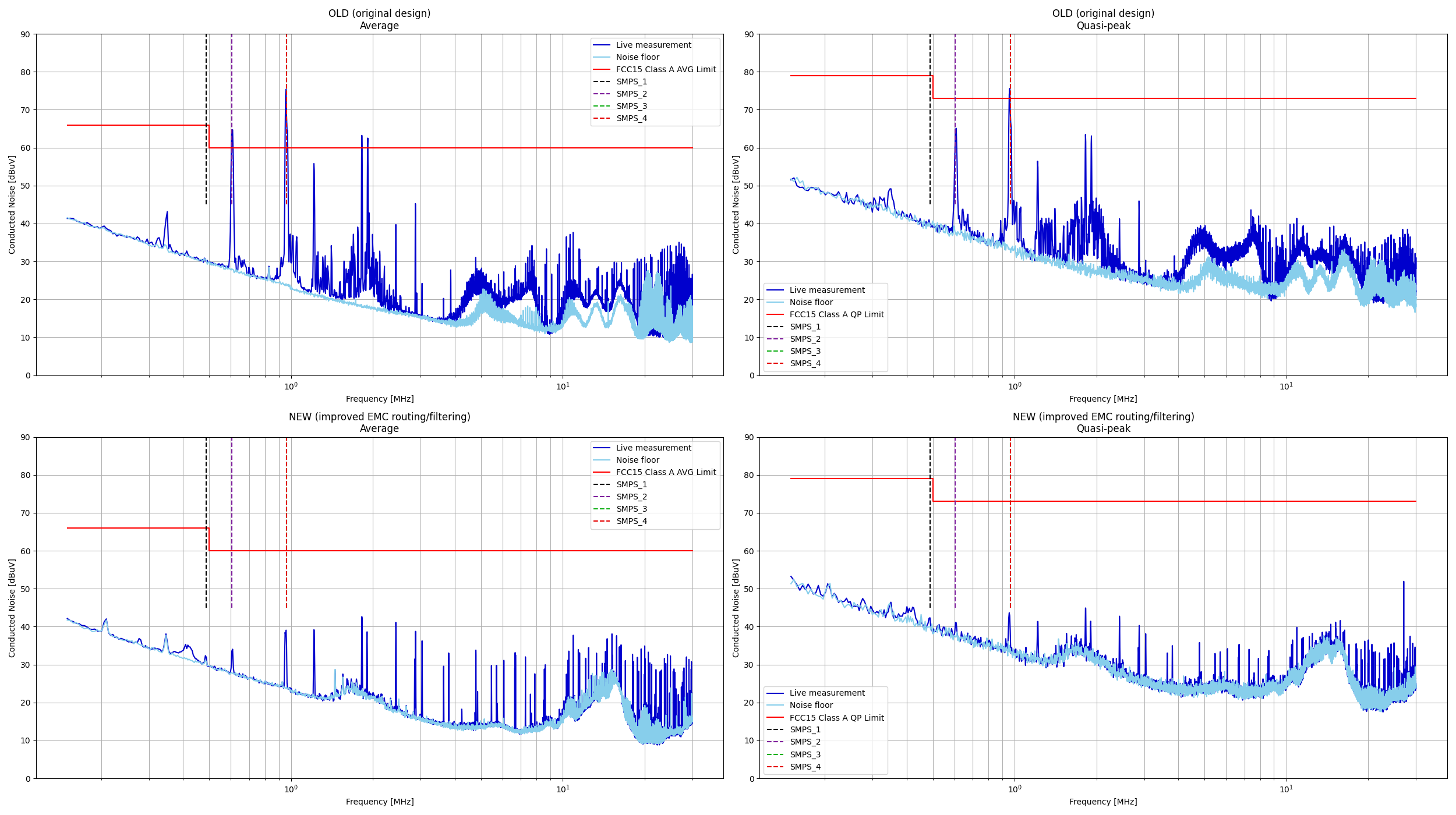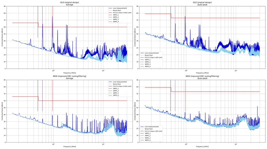 The results are shown below, and as you can see, there was a massive improvement in it’s EMC performance. OLD measurements are displayed on top, NEW measurements on bottom. Average values are displayed on the left plots, quasi-peak values on the right plots.