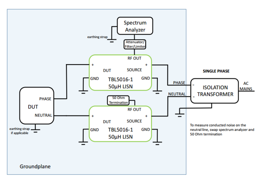 LISN wiring setup for measuring a single-phase AC powered DUT.
