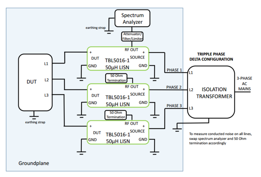 LISN wiring setup for measuring a three-phase (delta) AC powered DUT.
