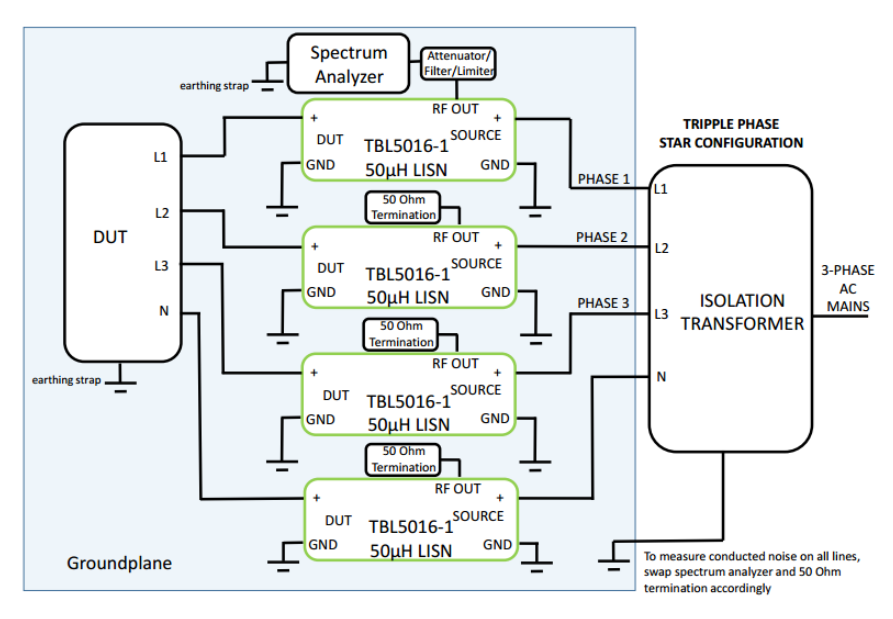 LISN wiring setup for measuring a three-phase (star) AC powered DUT.