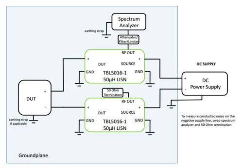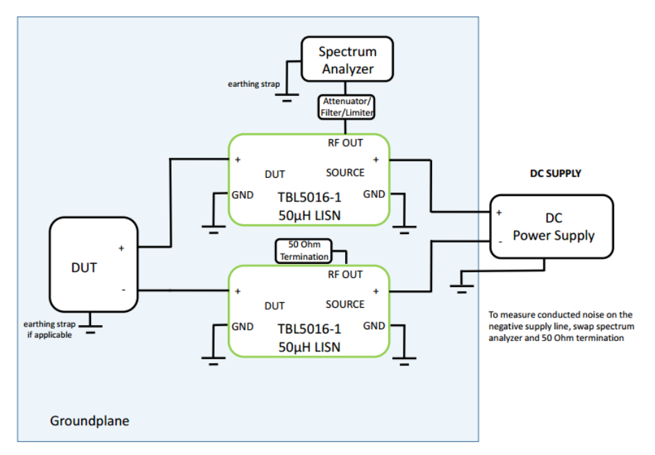 LISN wiring setup for measuring a DC-powered DUT.