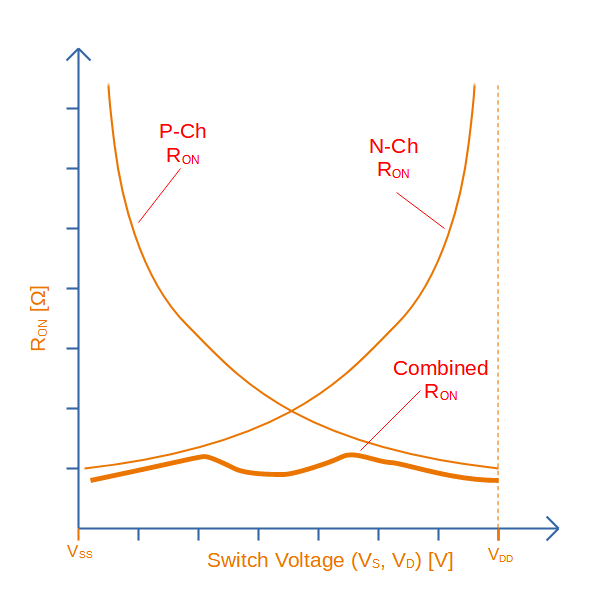 Notice how in the above image the total (combined) resistance is not constant, nor linear! This non-linearity can cause signal degradation depending on the input and output impedances of the circuity connected to it. Generally speaking, the on resistance of the analogue switch is not an issue if driven from a suitable “stiff” source, and passed through to a high-impedance input such as an ADC (assuming you allow for enough settling time, the input capacitance of the ADC will form a low-pass RC circuit with the switch resistance).