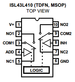 The Intersil ISL43L410 is a low on-resistance, low-voltage single-supply, DPDT analogue switch. One of its main selling points is it’s low power consumption with an (typ) and (max). Leakage current is (typ), (max).
