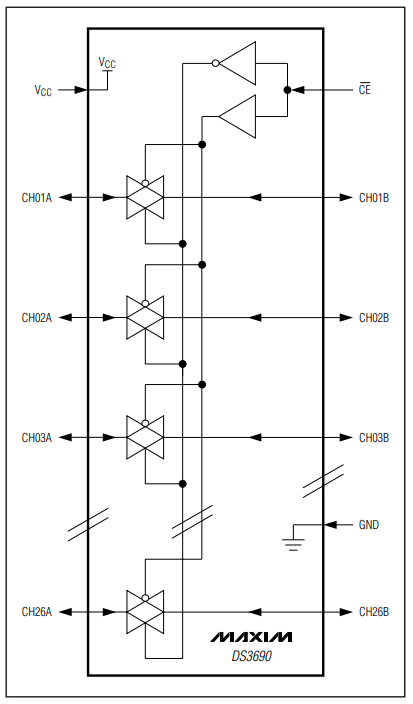 Maxim (2007, Oct). 3.3V 26-Channel, Three-Stateable Transmission Gate. Retrieved 2023-04-22, from https://www.analog.com/media/en/technical-documentation/data-sheets/DS3690T-DS3690TTRL.pdf. ↩ ↩2