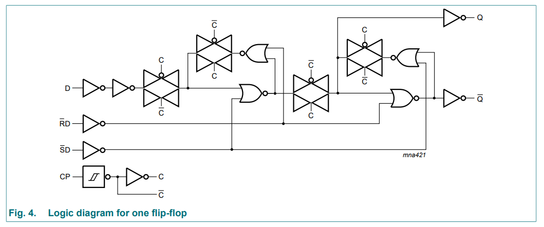 To show a real-world use case for a transmission gate, this is the logic diagram for the Nexperia 74HC74 dual D-type flip-flop IC3: