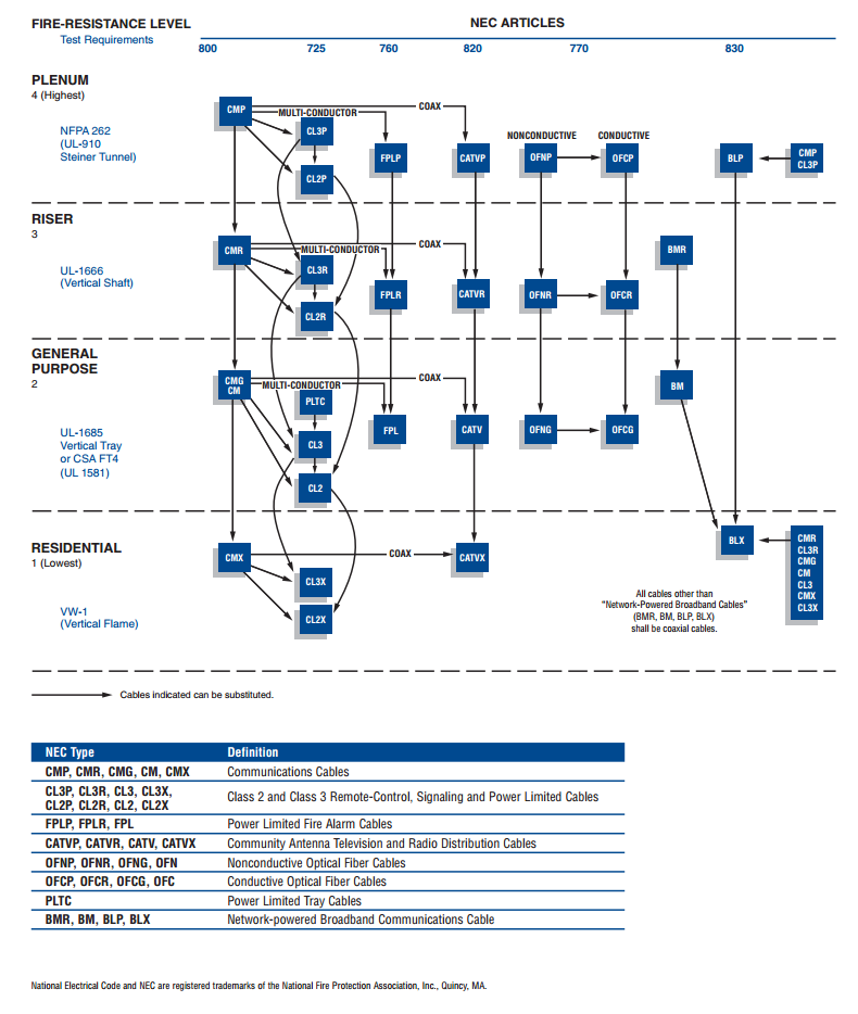 NEC types are acronyms consisting of a prefix describing cable type (e.g. coax, CATV, fibre optic) and a suffix indicating the type of flame test it has passed and where it can be installed.