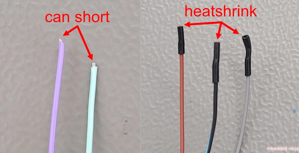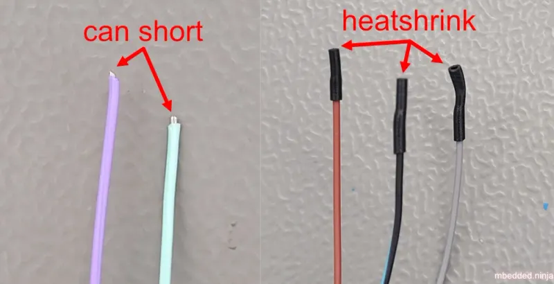 One way to fix this is to add small pieces of heat-shrink to the ends of the wires, as shown in This is a placeholder for the reference: fig-wires-with-exposed-ends-vs-heatshrink-to-prevent-shorts-photo. The heat-shrink is slipped over so that half of it is on the end of the wire, and then heated. You have to get tight fitting heat-shrink so that it grips the wire well and doesn’t slip off during use.