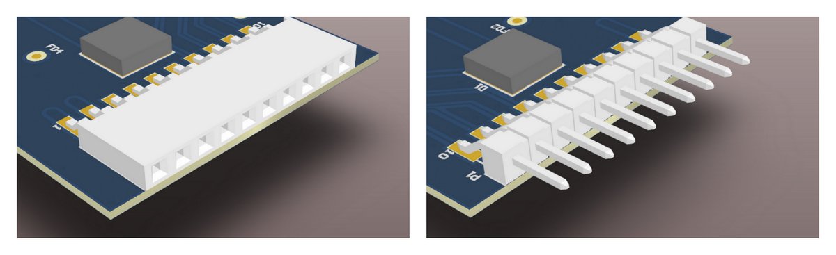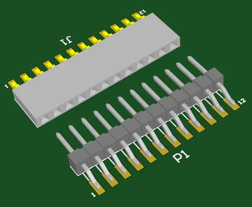 They are also a great, cheap way of connecting two or more PCBs together, as shown in the following image. A disadvantage is that this method is not as mechanically strong as some more expensive custom board-to-board connection methods.