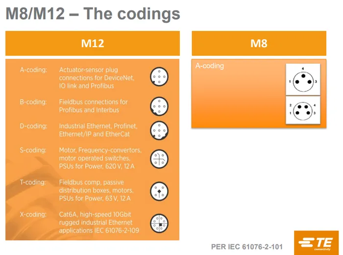 M8/M12 connectors have different codings. Each coding is a particular pin arrangement and key which prevents the same diameter and pin connector being mated with connectors with different codings.