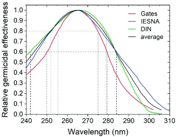 The dose of UV light required is usually specified as . The dose is rather complicated to calculate as it depends on a large number of factors including the microbe type, UV wavelength, humidity, irradiation time and other factors. However, roughly speaking, doses between 2-10mW/cm2 can give a 1 log reduction for a large number of microbes.5