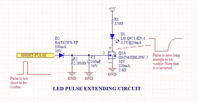One way to fix this with hardware to to use a simple pulse-width extender circuit as shown in This is a placeholder for the reference: fig-led-pulse-extending-circuit-schematic-annotated-rc-mosfet.