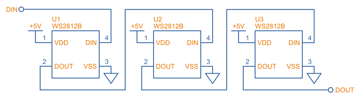 The WS28xx series of LEDs uses a custom, 1-wire, daisy-chainable protocol for communication. This is a placeholder for the reference: fig-ws2812b-typical-application-schematic shows an example application schematic showing how they can daisy-chained together. Microcontroller SPI peripherals running at 16x the WS28xx bit rate can be used to generate the data stream.