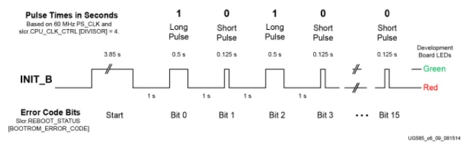One example of this is the Zynq 7000 SoC’s BootROM. The BootROM is the basic code that runs on startup that loads the FSBL. To indicate an error, it toggles a pin high and low. It is designed so that you can connect an LED to this pin and see the error code. The waveform of the LED error code output by the Zynq 7000 BootROM is shown in This is a placeholder for the reference: fig-zynq-7000-bootrom-led-error-code-waveform.
