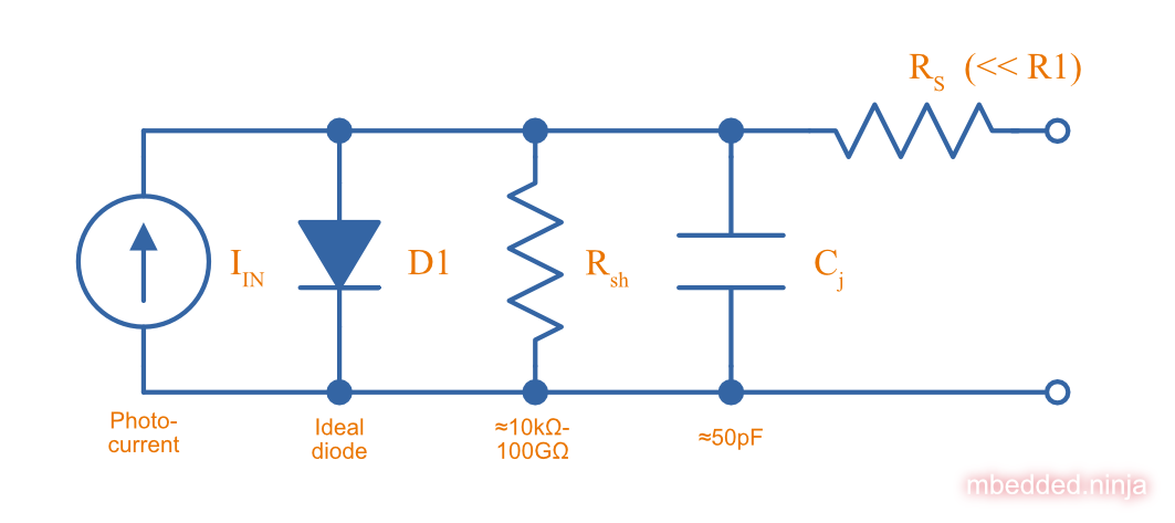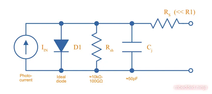 Robert Keim (2020, Dec 23). Understanding the Photodiode Equivalent Circuit. Retrieved 2022-02-27, from https://www.allaboutcircuits.com/technical-articles/understanding-the-photodiode-equivalent-circuit/. ↩