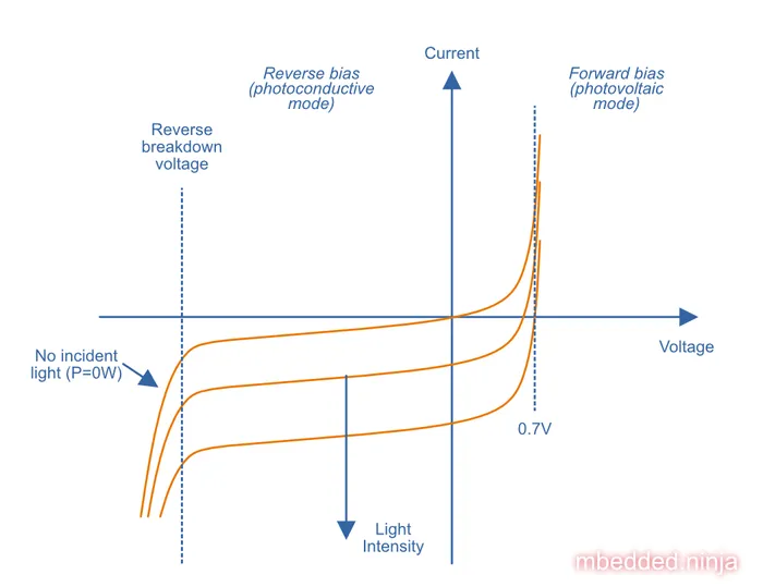 The typical relationship between the photodiodes voltage and current is shown in This is a placeholder for the reference: fig-photodiode-voltage-vs-current.