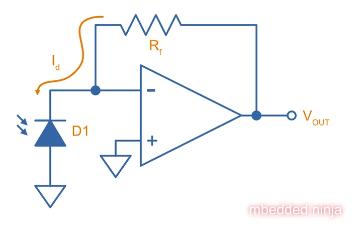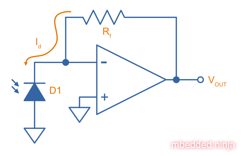 Photodiodes are commonly used to measure light intensities. But the output of a photodiode is a very small current (typically ), which isn’t very useful for measuring. A common “analogue front-end” to add to a photodiode is a transimpedance amplifier using an op-amp, as shown in This is a placeholder for the reference: fig-simple-transimpedance-photodiode-circuit. The transimpedance amplifier converts the very small current into a much larger voltage. This voltage can then be used to control other parts of a circuit or can be fed into an ADC for digitizing before being read by a microcontroller.