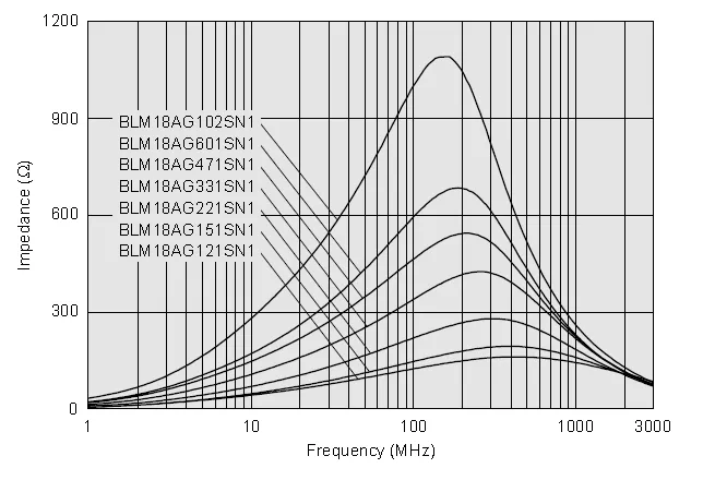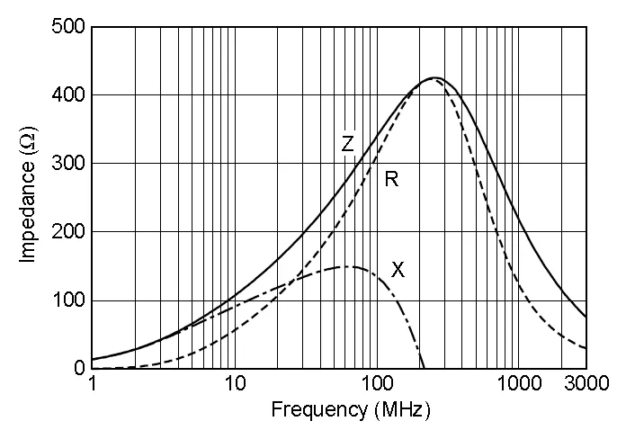 The following graph shows the typical impedance of a ferrite bead across a range of frequencies.