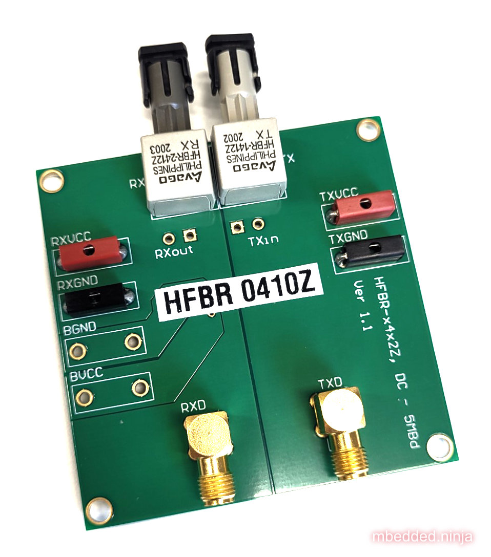 Development kits such as the HFBR-0410Z shown in are available for quick prototyping with with fibre-optic system. Note that the dev kit does not come with any cable!